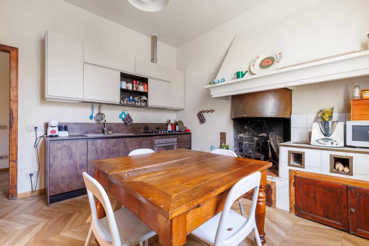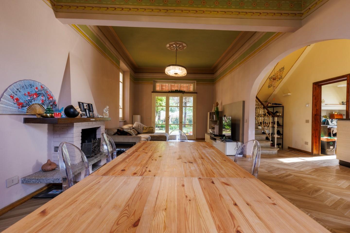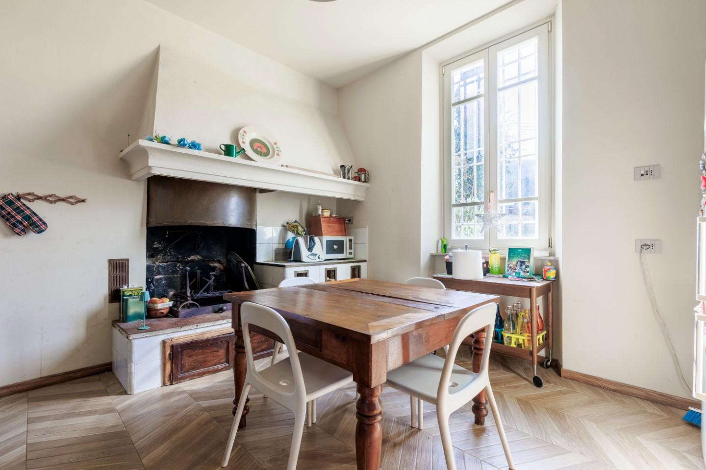 All’ingresso della villa si viene accolti da un portone d’epoca che introduce a un piano terra ampio e luminoso, dove gli ambienti scorrono in modo armonioso. La cucina abitabile, impreziosita da un caratteristico caminetto, dialoga con un soggiorno di grande metratura, anch’esso dotato di camino e affacciato direttamente sul giardino, creando uno spazio perfetto per vivere momenti conviviali e di relax. Sempre al piano terra si trova anche uno studio, ideale per chi lavora da casa o desidera uno spazio dedicato alla concentrazione. Completano il livello un bagno di servizio, una veranda e un garage ristrutturato e pavimentato, perfetto anche come ambiente jolly da adattare alle proprie necessità. Il riscaldamento a pavimento assicura comfort in ogni stagione.