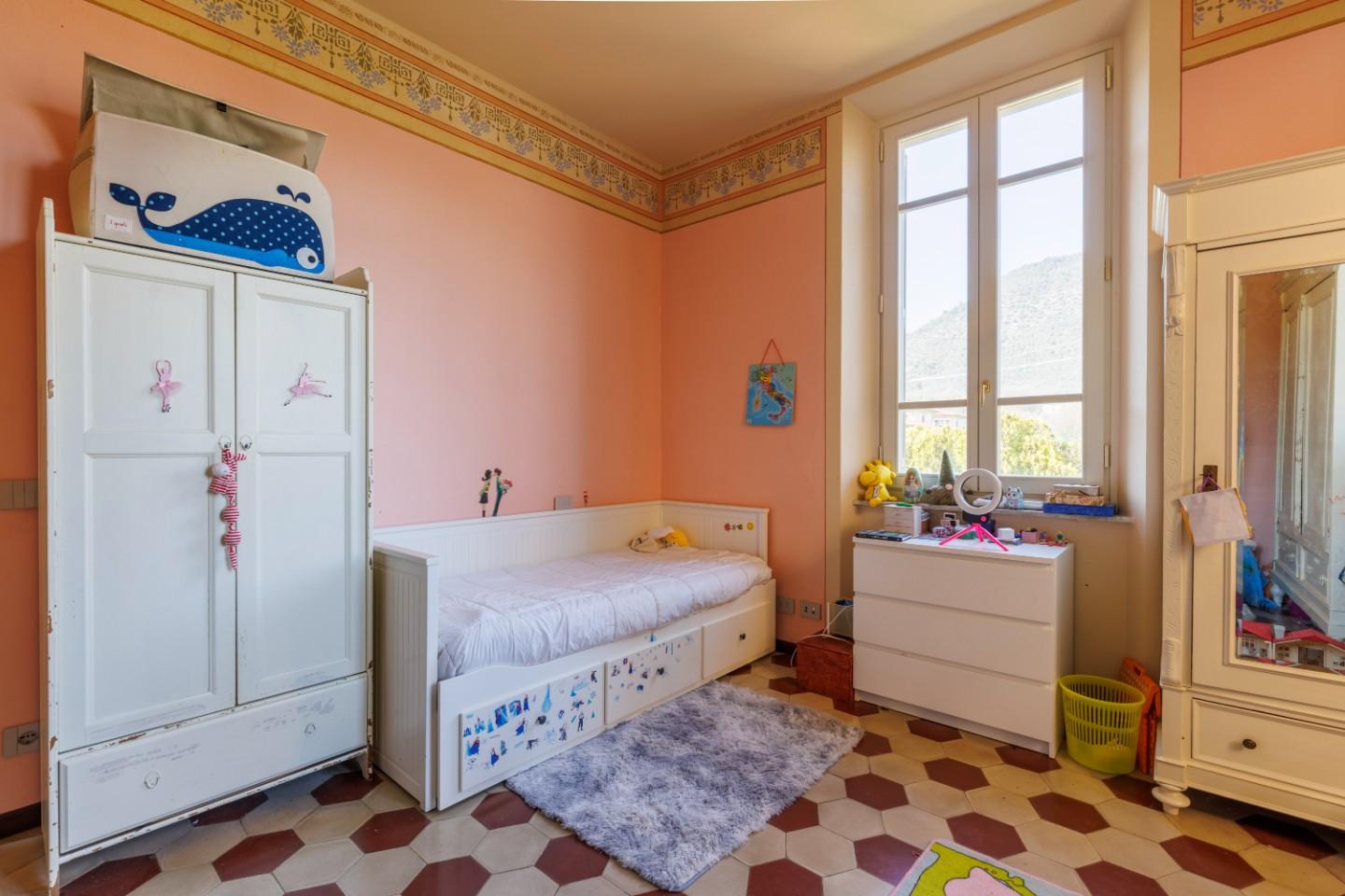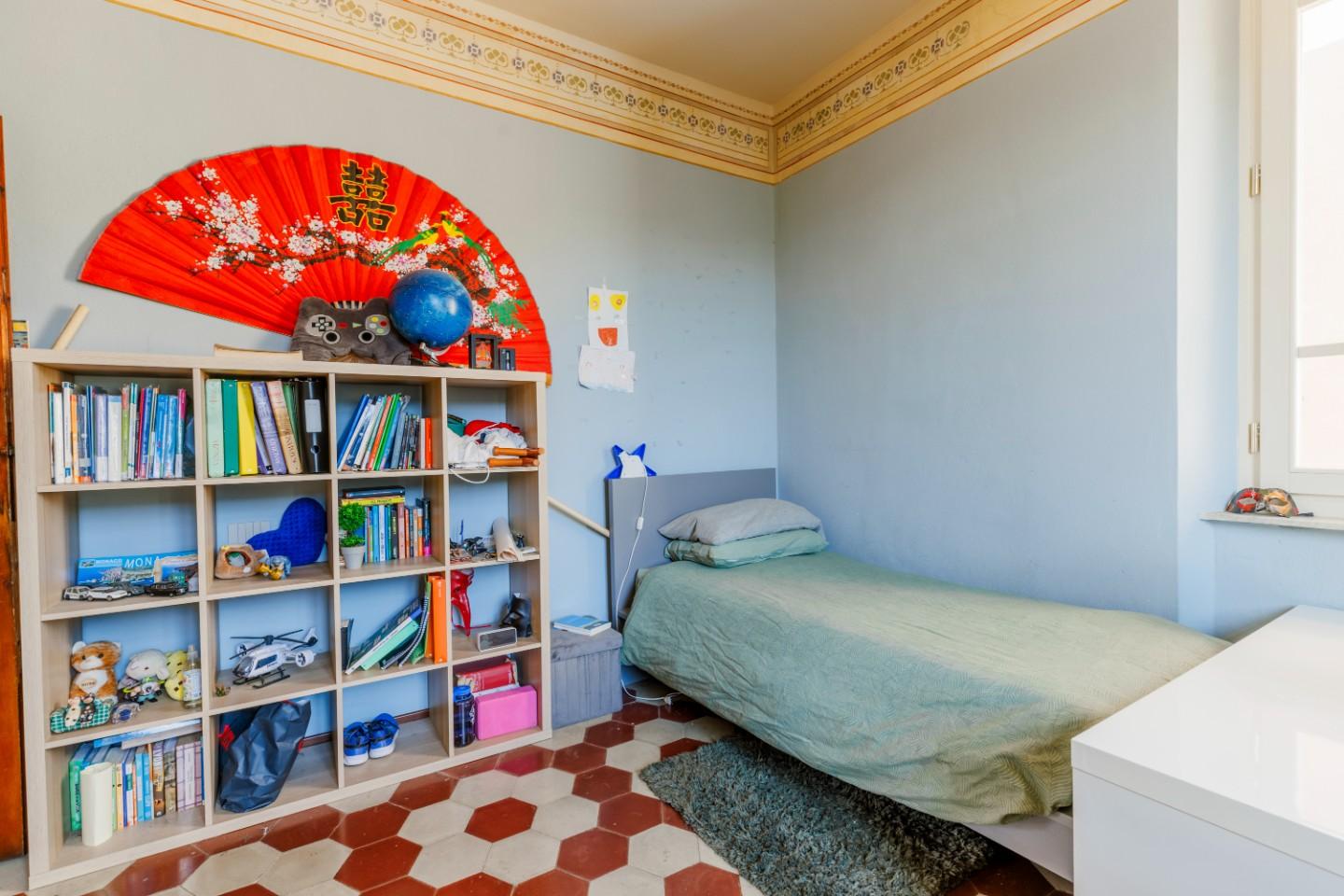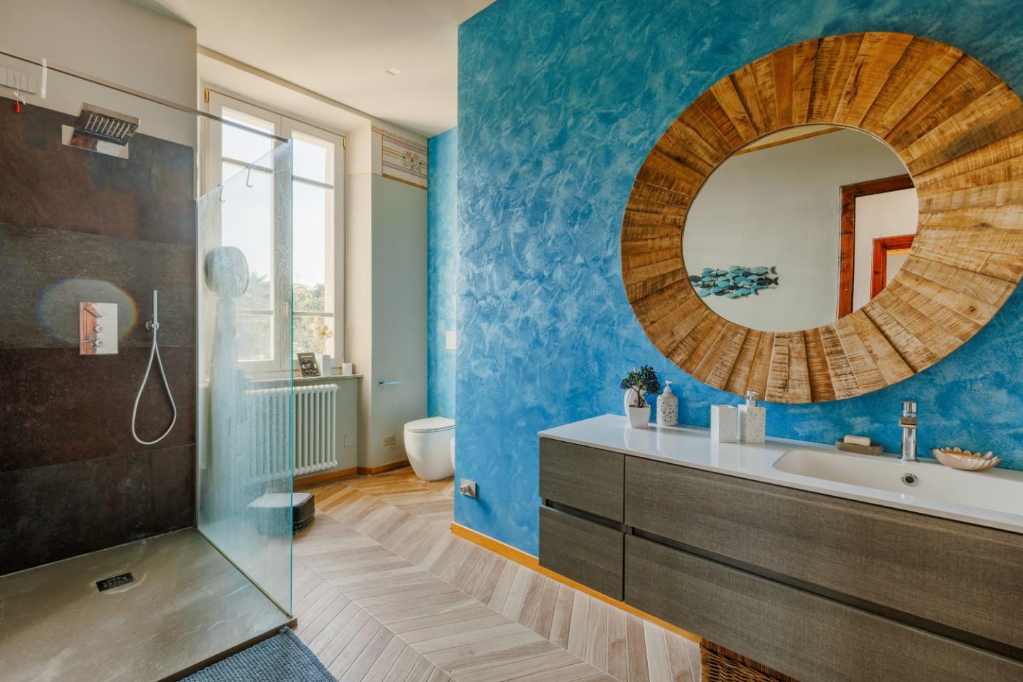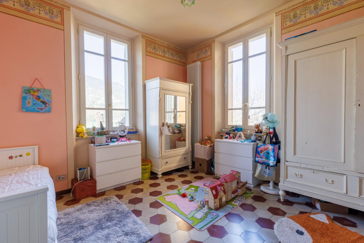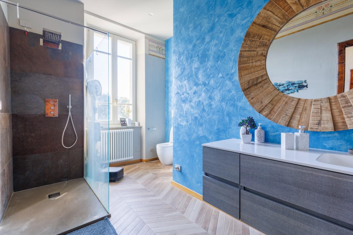 Salendo al primo piano si scopre un reparto notte progettato con particolare attenzione al comfort. Oltre alle tre camere da letto, spicca una suite matrimoniale dotata di bagno privato e cabina armadio. Due terrazzi portano luce naturale agli ambienti e un secondo bagno, insieme alla lavanderia, completa la funzionalità del piano. Qui il riscaldamento a radiatori mantiene un’atmosfera accogliente e tradizionale.